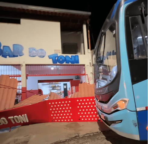 Um ônibus da empresa Transporte Cisne Vita atingiu a placa de um bar e arrancou parte do telhado do estabelecimento no fim da tarde desta terça-feira (17), no bairro Fênix, em Itabira.
